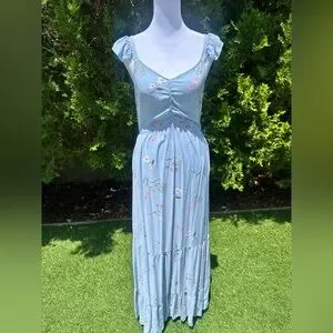Blue Ruched Maxi Sundress with Flutter Cap Sleeves