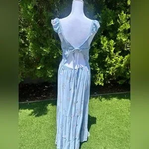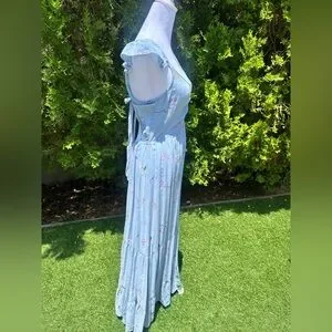 This casual sundress in a serene blue hue features a scoop neckline and flutter cap sleeves, offering a relaxed yet stylish look. The ruched detailing adds texture to the maxi length, making it perfect for warm weather outings. Its flowing silhouette ensures comfort and ease of movement.
