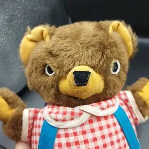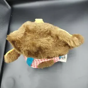 This is a vintage, Fisher Price, Roly poly round teddy bear plush chime toy. He does NOT come with his original bib and does show normal wear. He is a little "wonky", but still chimes away when you roll him. He even has a funny look on his face like he's angry! :) No holes or rips to the bear or fabric, overall, a fun find! Be sure to check out all of the photos!