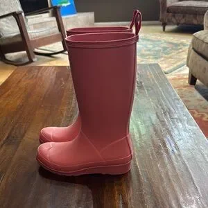 Step out in style and comfort with these Hunter pink winter rain boots, designed to keep your feet dry and cozy. Crafted from durable waterproof material, these boots feature a sturdy rubber sole and a classic rounded toe. The vibrant pink hue adds a pop of color to any rainy day ensemble. NEW NO BOX