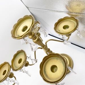 Enhance your home decor with this elegant gold candelabra set. Featuring stunning crystal accents, these candelabras add a touch of sophistication to any room. Set of 2. Some stand only have 3 crystals instead of 4.