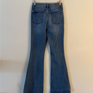 Embrace a retro vibe with these Judy Blue jeans, featuring a dramatic flare and wide leg design. The medium-wash denim offers a consistent blue tone with subtle fading for a vintage-inspired look. Perfect for making a statement, these jeans are fitted through the thigh before flaring out below the knee.