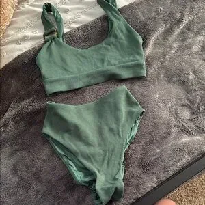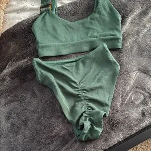 Stylish ribbed bikini set. Features a scoop neck top and high-waisted bottoms. Perfect for a chic beach look. Worn once.