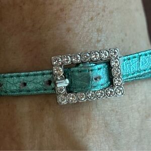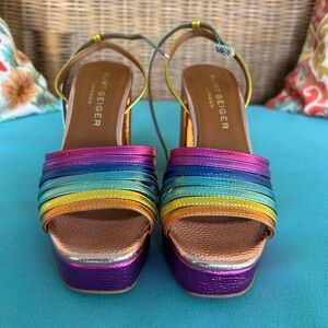 Bold metallic platform sandals with vibrant straps. Features pink, blue, and gold hues. Perfect for a standout look 🌈