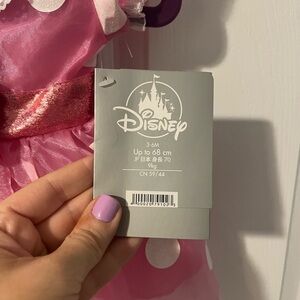 Charming dress with pink and white polka dots. Features a shiny bow and Minnie Mouse detailing. Ideal for playtime fun. Fabric is shimmery- back Velcro closure. NWT genuine Disney merchandise, 6-9 month size.