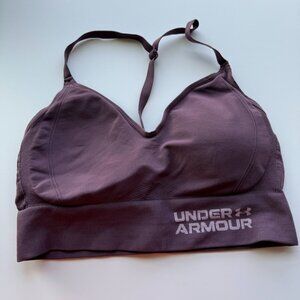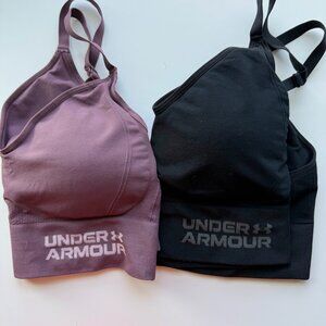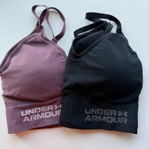 Get active in comfort and style with this bundle of 2 Under Armour padded sports bras, both in women’s size XL. This set includes one solid black bra and one mauve/purple bra with Under Armour branding on the band.