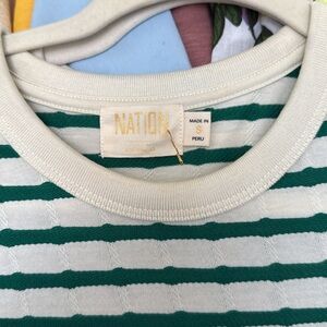 This casual midi dress by Nation LTD features a striking green and cream color palette, perfect for relaxed outings. Designed with a crew neck and short raglan sleeves, it offers a comfortable fit while maintaining a stylish sheath silhouette. The peter pan collar adds a touch of charm to this versatile piece.