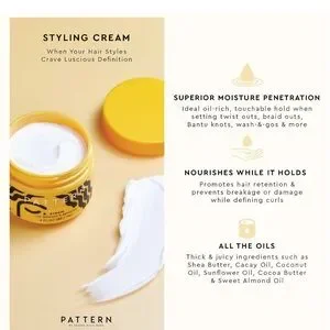 What Else You Need to Know: Styling Cream provides superior moisture penetration and touchable hold when setting hairstyles: twist outs, braid outs, Bantu knots, wash-and-gos. Shea butter, cacay oil, and sweet almond oil nourish the hair while preventing breakage and damage.