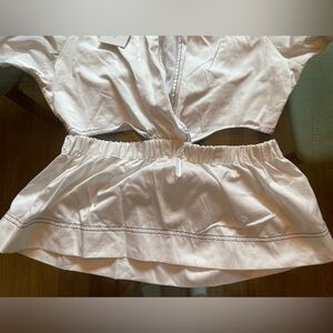 Something Navy top with cut out at the waist. Color is white. Size Medium. Hard to measure because you have that cutout in the middle. Puffy sleeves. It’s kind of open at the front. Approximate measurements on the pictures!