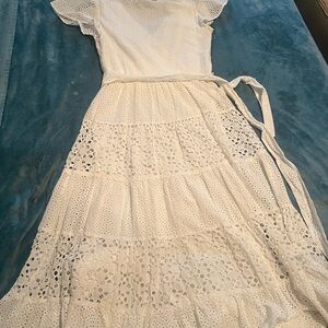 Chic white midi dress with eyelet details. Wrap style with a tie waist. Perfect for versatile styling.