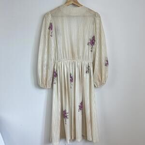 Vintage Mr. Edward S / M Cream Cottagecore Midi Dress Plunge V Neck Pleated Prairie Purple Floral Feminine