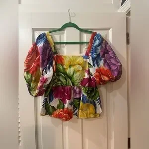 This vibrant blouse from FARM Rio features a striking combination of red and pink hues, perfect for making a statement. The short sleeves and ruffled peplum design add a playful touch to this stylish top. Ideal for any occasion, this blouse effortlessly combines elegance with a hint of fun.