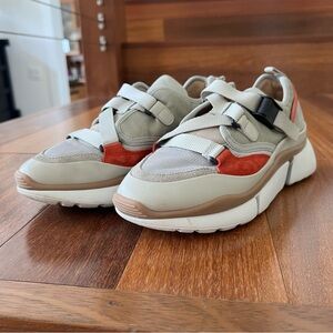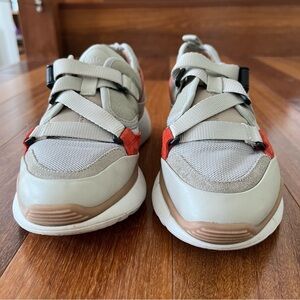Trendy sneakers with a mix of gray, red, and tan colors. Perfect for casual wear.