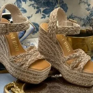 Elevate your summer style with these Gianni Bini wedges, featuring a chic tan color and a high woven jute heel. The braided straps and open-toe design offer a perfect blend of casual elegance, making them ideal for any warm-weather occasion.