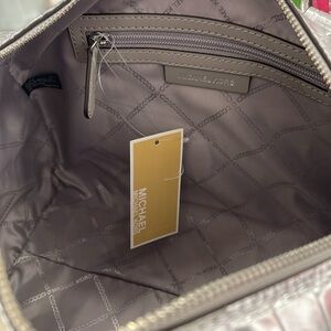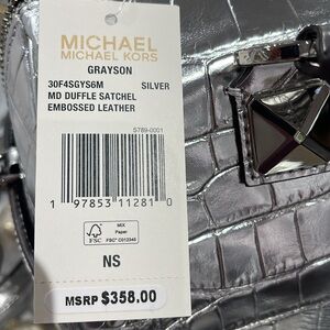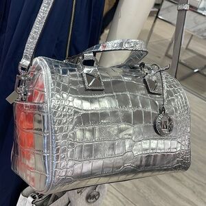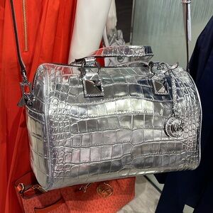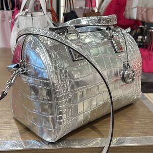 Elevate your style with the Michael Kors silver crocodile embossed satchel. This chic bag offers a luxurious look with its sleek design and metallic finish. Perfect for any occasion, it combines elegance and functionality.