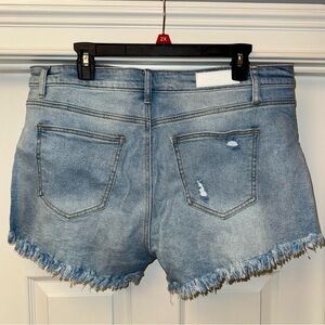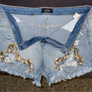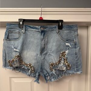 Chic blue jean shorts with sparkling embellishments. Frayed hem adds a trendy touch. Ideal for casual outings.