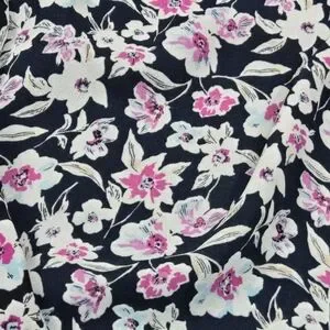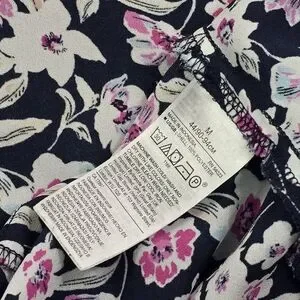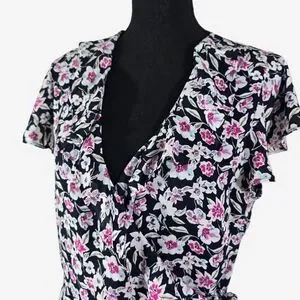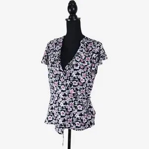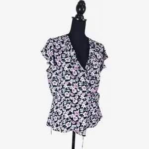 Flattering Banana Republic floral wrap blouse in a classic, feminine silhouette. Features a black base with soft pink, white, and light blue floral print for an easy polished look.