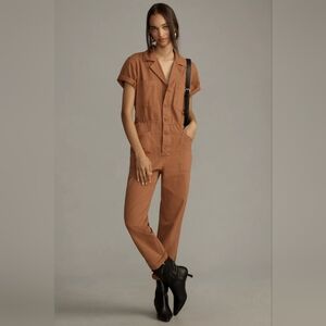 This tan jumpsuit by Pistola features a stylish V-neckline and a relaxed, straight-leg fit. Crafted for comfort, it embodies a modern workwear aesthetic with its short-sleeved design. Ideal for casual occasions, this piece offers a versatile and chic look.