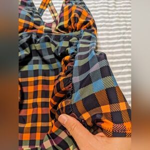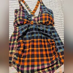Super cute Motherhood Maternity checkered one piece bathing suit in vibrant shades of orange, blue, yellow, and purple