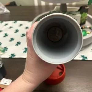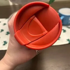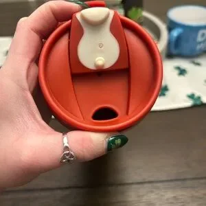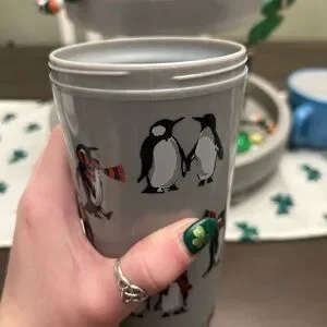 Stylish travel mug featuring penguin design. Red lid adds a pop of color.
