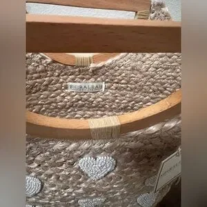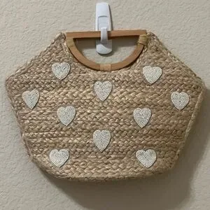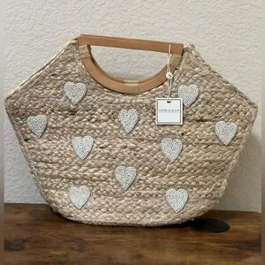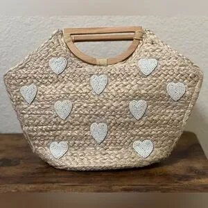 Shiraleah Natural Straw Tote with Beaded White Heart Details