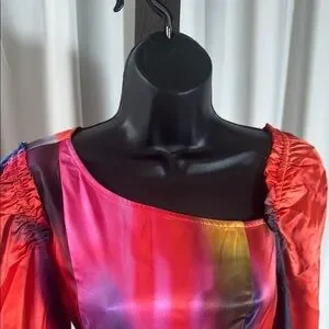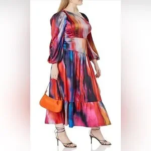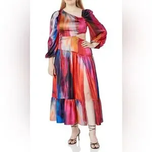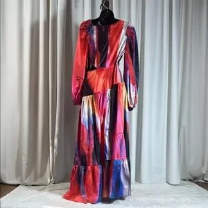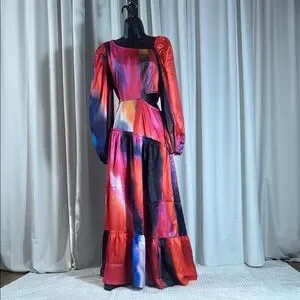 Stunning maxi dress with a vibrant multicolor pattern. Features a stylish side slit and long sleeves.