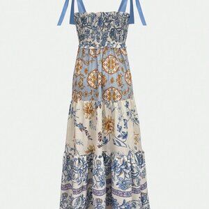 Multicolor Casual Women's Floral Print Lace-Up Spaghetti Strap Pleated Dress