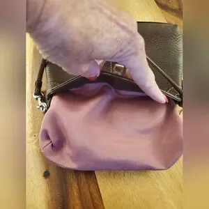 This brown leather COACH mini bag is in GREAT CONDITION! Clean inside and out! Turn lock closure, lavender lining, with 1 slip pocket, orginal hang tag and a 12" strap that can be used as a purse or clipped to one side as a clutch. It is an older bag and has some natural ware to the leather, but no major flaws! Approximate measurements: 7.5" wide, 5" height, 1.5" deep when filled, with a 12" strap.