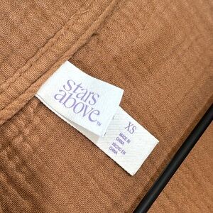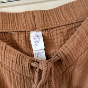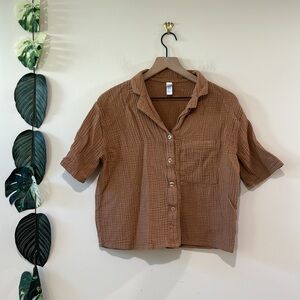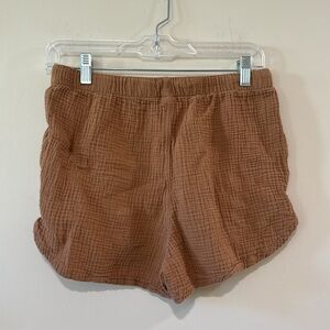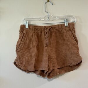 Comfortable brown pajama set. Short-sleeve top with collar. Matching shorts with drawstring.