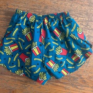 Vibrant shorts with a colorful french fry pattern. Perfect for running. BOA. Teal background with french fries and polka dots. athletic shorts. barely worn. IF YOU MAKE A BUNDLE WITH THE OTHER RUNNING SHORTS I WILL GIVE A GOOD DEAL!!!!!!!!!!!