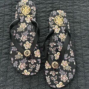 Stylish Tory Burch rubber sandals with floral design. Features black straps and gold logo detail.