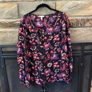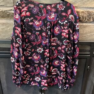 Elevate your style with this chic floral print top. Featuring a blend of black and pink, and slightly sheer, this top is perfect for any occasion. Enjoy comfort and elegance in one piece. 100% silk.