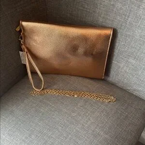 This elegant gold clutch bag is perfect for any occasion. Its sleek design and shimmering finish add a touch of sophistication to your outfit. Magnetic closure, inside features a large zipper compartment with a zipper coin pocket. Matching crossbody chain included. Some pitting is shown in pics from storage, but there is no damage. Measurements in pics. As Is Sale. Please examine all pictures prior to purchase.