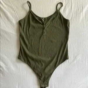 Stylish olive green ribbed bodysuit with button details. Perfect for layering or wearing alone. Great condition!