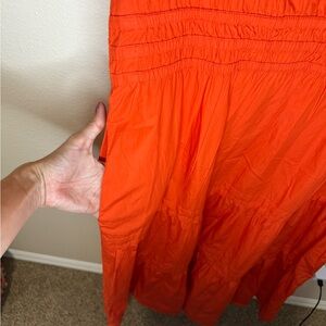 Embrace effortless elegance with this vibrant orange sundress from Quince, featuring a smocked bodice and tiered maxi skirt. Designed with short puff sleeves and a crew neck, this dress is perfect for resort wear or casual outings. Its lightweight fabric and flowy silhouette ensure comfort and style in warm weather.
