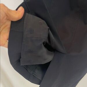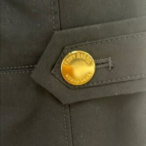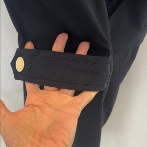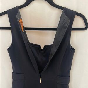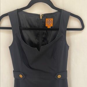 This elegant navy dress features stylish gold accents, perfect for any occasion. Its sleek design offers a sophisticated look.