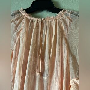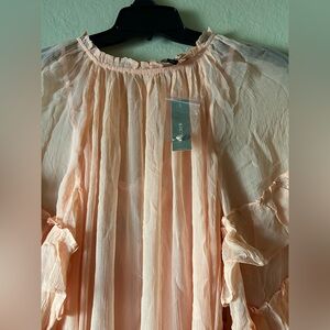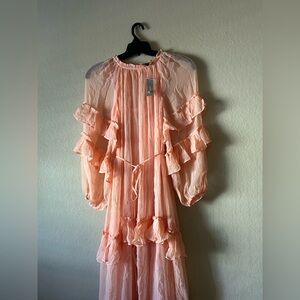 This stunning orange maxi dress by J. Crew features elegant ruffled that create a flowing silhouette, perfect for a wedding guest or cocktail event. The long bishop sleeves add a touch of sophistication, while the lightweight fabric ensures comfort and ease of movement. the hem and sleeves don’t have any ties, the is a tie at the waist for a touch of structure, this dress is designed to move with you effortlessly. Plus, it's crafted from floaty, subtly sheer chiffon fabric and comes with a slip lining underneath for coverage.