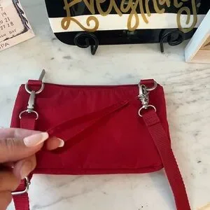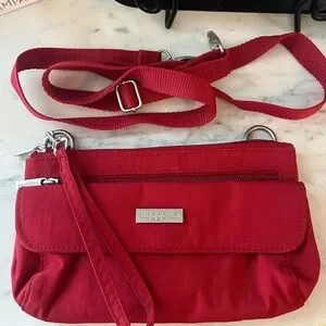 The Baggallini Red Crossbody Bag is a stylish and functional accessory, featuring a vibrant red color and a practical multi-compartment design. This bad has a removable strap to make it the perfect little wristlet. Perfect for everyday use, this bag offers convenience and a casual look for those on the move. EUC only used a few times and a rare design for them.