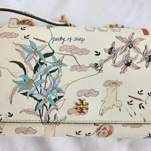 This Tory Burch crossbody bag combines elegance and functionality with its cream base and gold chain strap. The delicate floral design adds a touch of romance, making it a perfect accessory for any occasion. Its structured silhouette and flap closure ensure both style and practicality. Brand new without tags.