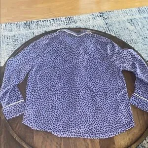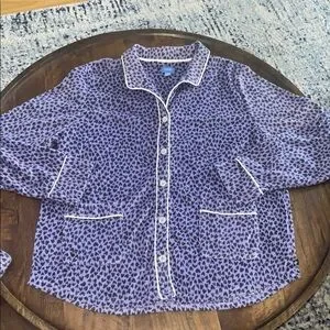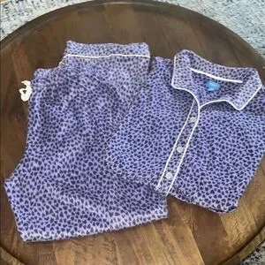 Cozy and stylish women’s pajamas featuring a playful Purple Heart print, super comfy plush feel. The top is button down and long sleeve, drawstring pants. Perfect for a comfortable night's sleep. Only worn a couple times, like new condition. 31” inseam, arm length is 19”.