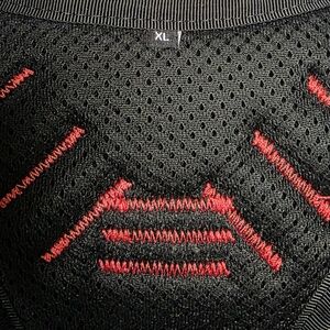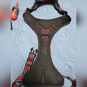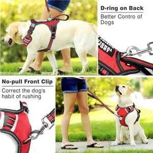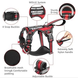 Red service dog harness featuring multiple patches and adjustable straps. Includes a 💩 baggie holder