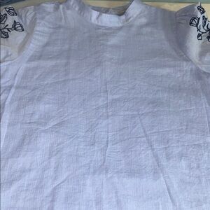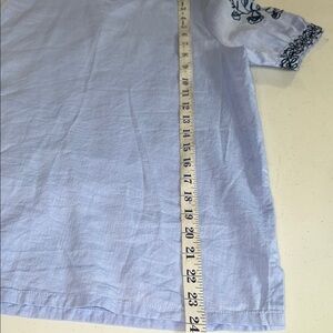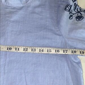 This exquisite LOFT blouse features a delicate light blue hue, adorned with intricate embroidery on the sleeves, offering a touch of elegance and sophistication. Perfect for elevating your wardrobe, this top combines style and comfort effortlessly.
