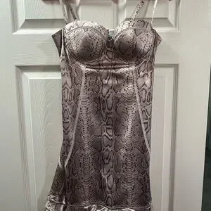 Elegant snake print slip dress with bustier top. Perfect for a chic and daring look.