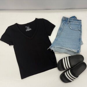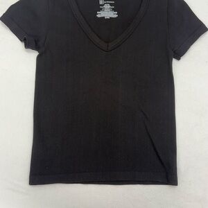 Classic black V-neck top. Ribbed texture. Versatile and stylish.