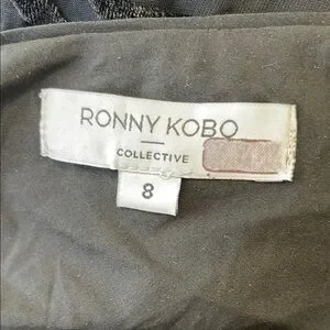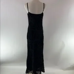 Elegant black spaghetti strap dress by Ronny Kobo. The black geometric velvet design adds subtle edge.