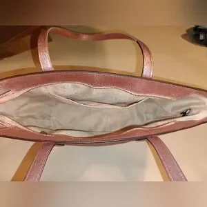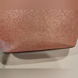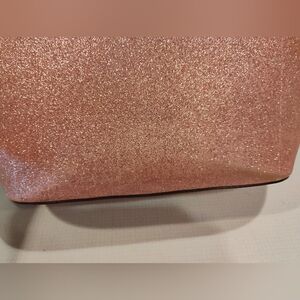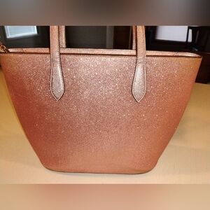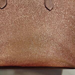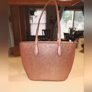 This Kate Spade glitter tote bag has been well loved and has wear marks on front and back with slight creasing along the bottom. The handles are worn with some of the edging missing and has some stray threads. The top zipper works well. It's far from perfect, but shimmering pink color adds a touch of fun to your outfit. Ideal for daily use. FAIR USED CONDITION.