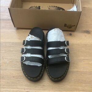 Chic black sandals by Dr. Martens. Features three adjustable buckles.