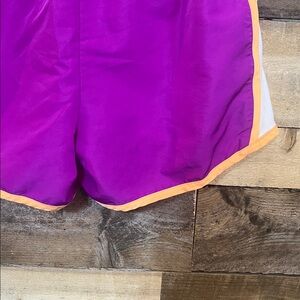 Athletic/running shorts, Women's size M (8-10), Dark fuschia color with white and neon orange accents, other than a very small stain on the back, these shorts are in good preowned condition. Please see pictures for information and measurements. Price has been adjusted accordingly. Check out my closet – bundle and save on shipping. Bundle two or more items and get an additional discount.