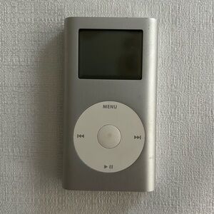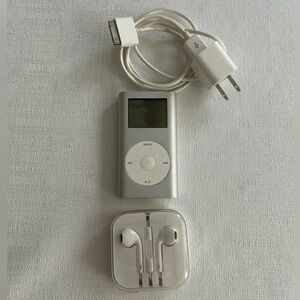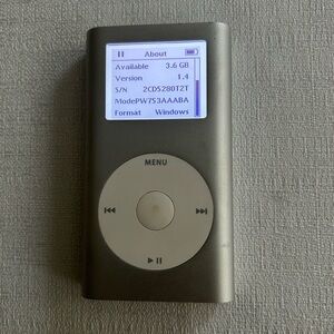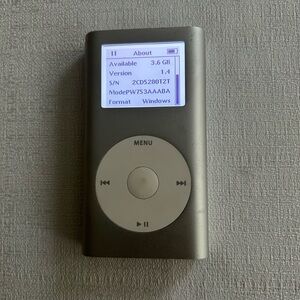 Vintage 2005 Rare Apple iPod Mini 2nd Generation HP Windows Edition 4GB, Silver, Model MP5001, can hold up to 1000 songs ( comes with 40 songs) included are power cord and new Apple Earphones.