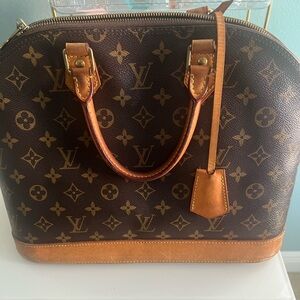 LV ALMA GM Mono Gram Bag. (LV No Longer Makes the GM Bag Size). Light water spots on bottom leather trim & line mark on bottom- look at pics.